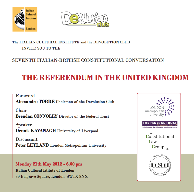 The event is organised by the Italian Cultural Institute of London, the Devolution Club, the UK Constitutional Law Group, the Federal Trust, London Metropolitan University, and the Center for Constitutional Studies and Democratic Development.