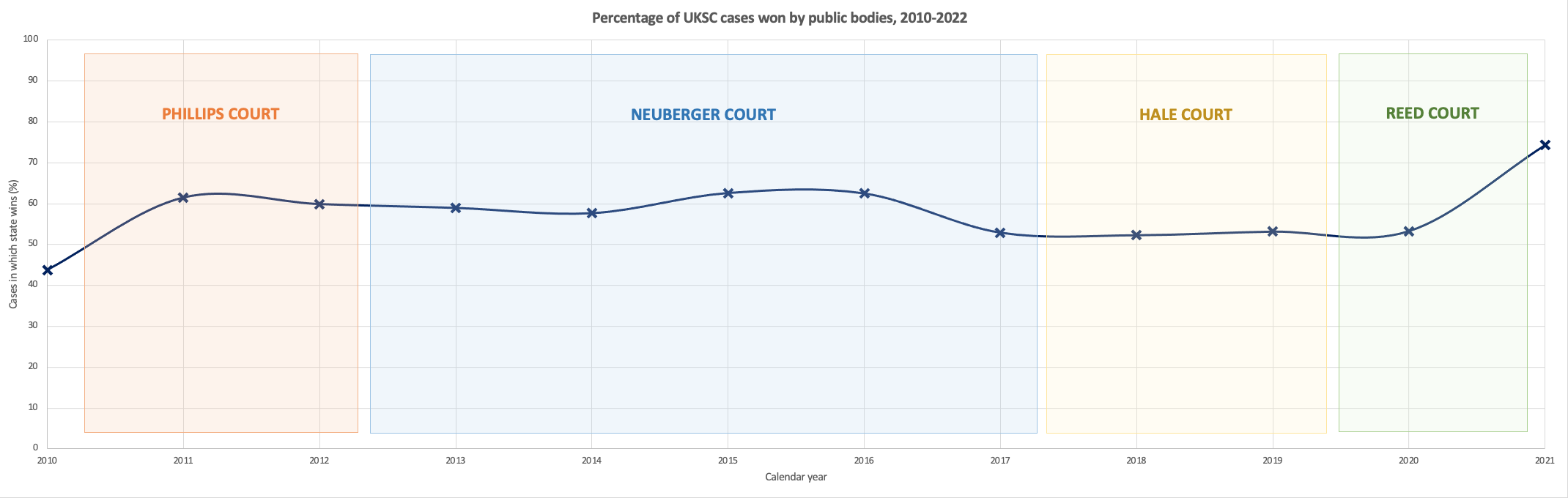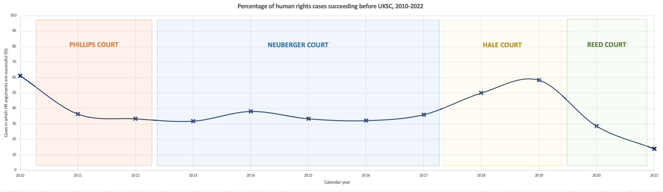 Despite these limitations, the empirical evidence does seem to suggest that the Reed court is more conservative when it comes to public law – at least in terms of a tendency to reject human rights claims and to side with public authorities – than its predecessors. I noted above that Gearty’s account was a scathing one. It is suggested, taking into account the winners and losers of the court’s output over the last two years, that it is also an accurate one.