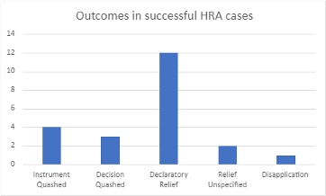 Declarations are by far the most commonly granted form of relief. Over half of all successful challenges to secondary legislation resulted in a declaration and 60% of these were granted in HRA claims. The vast majority of these were declarations under Section 31(2) of the SCA to the effect that the SI was unlawful in light of a given ECHR right. Only one case at final instance in the dataset resulted in a Section 4 HRA declaration of incompatibility (DOI).