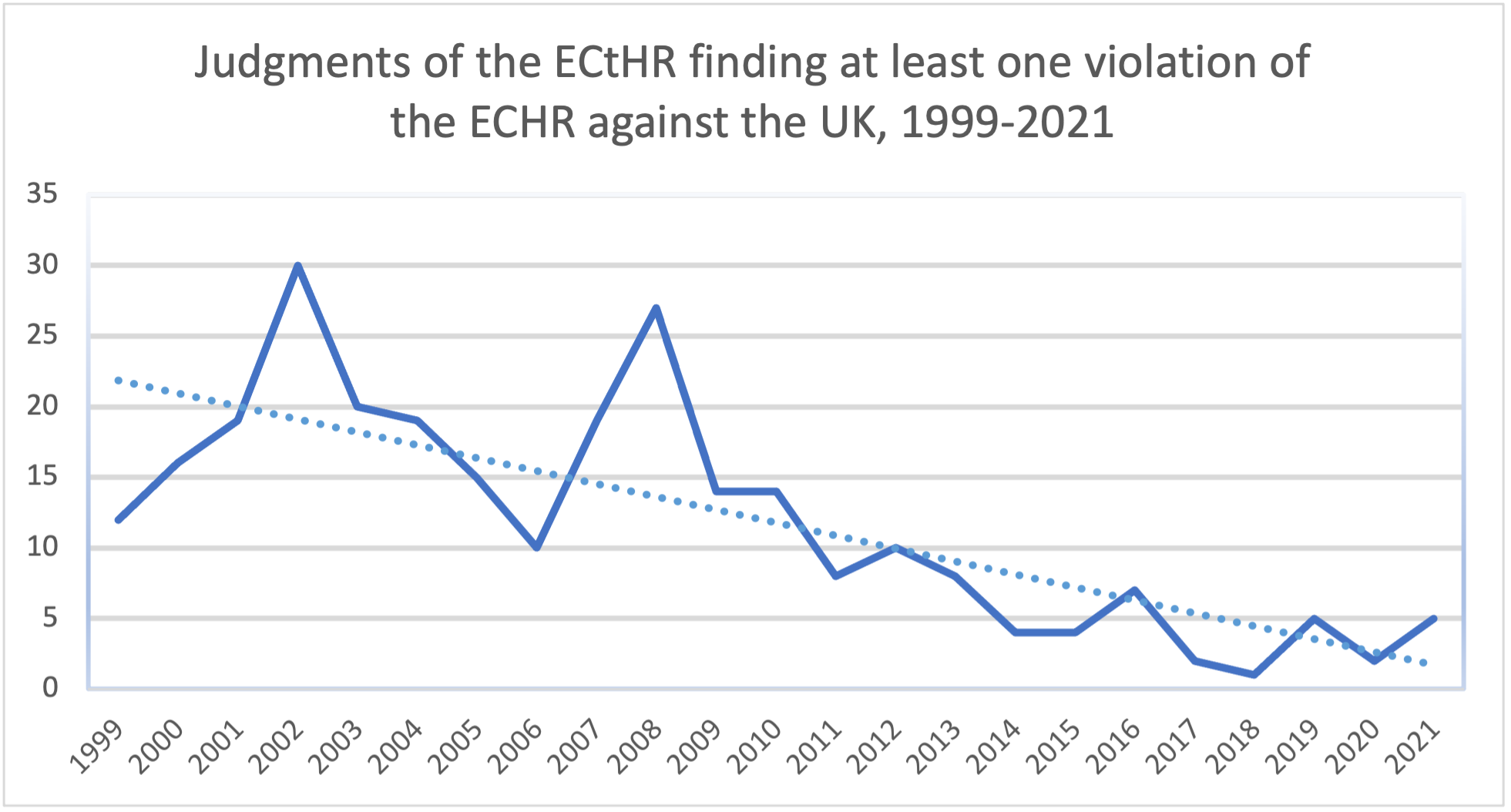 When the Human Rights Act 1998 was passed, and human rights were “brought home”, the expectation was that the number of judgments finding violations against the UK would decline. And so it has come to pass. As shown below, the average number of violation judgments per year in the past decade (2012-2021) was fewer than five, whereas the average for the preceding decade (2002-2011) was almost 18.