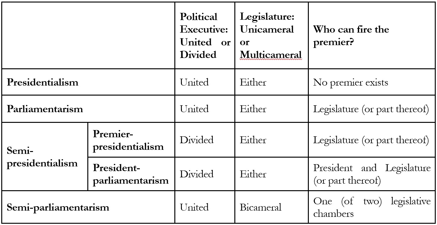The general normative defence of bicameralism (for example, by Waldron) rests on its design being incongruent: i.e. where the two houses are structured such that their respective partisan make-up does not mirror the other’s. There are many ways in which an incongruent second chamber can be designed, including through a system of appointments (as is largely the case with the House of Lords) or through direct or indirect elections. A bicameral system where both chambers are directly elected by the people is hardly a novel proposal for constitutional design. Although more common in presidential systems such as the United States, two directly elected chambers have existed in parliamentary systems too, including in Japan, and in the federal and several provincial governments of Australia. In fact, two elected legislative chambers in a parliamentary system has recently been identified by Ganghof as a distinct form of separation of powers, viz semi-parliamentarism. Unlike semi-presidentialism, which splits the higher executive into a president and a prime minister, semi-parliamentarism insists on a split between the legislature into (at least) two directly-elected chambers. The following table explains how semi-parliamentarism sits with the other models of organising representative government (i.e. presidentialism, parliamentarism, and two versions of semi-presidentialism):