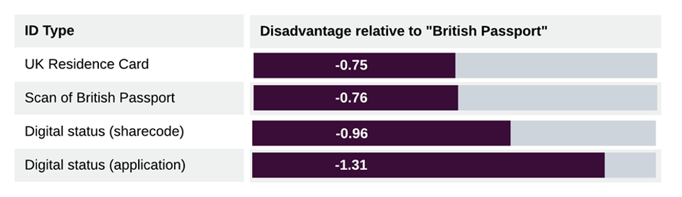 Regression analysis demonstrates that the order of preferences of landlords were for a British Passport, a UK residence card, a scan of a British Passport, digital status and – least of all – a digital status showing a pending application. Figure One details the extent of disadvantage for each ID type, relative to a British passport. Expressed in terms of probabilities of being chosen, this means that a male, English tenant – aged 20 years old and working as a retail assistant – would have a 48% probability of being chosen with a British Passport, a 28% probability with “digital status” and a 21% probability with proof of application for digital status.